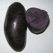 紫黑色马铃薯(俗称紫色马铃薯/黑马铃薯):薯形呈长椭圆形,芽眼较小。因其富含花青素等天然色素,使之果皮呈黑紫色,富有光泽,果肉为深紫色。其外型似小型紫薯,但比紫薯光滑光亮。外观好看,颜色诱惑力强,产品加工过程中无需添加任何色素和增色剂,极为健康。属新奇特农产品,由于生长过程中极少使用农药,且薯块富含抗氧化剂-花青素,一般被认为是绿色、健康食品。